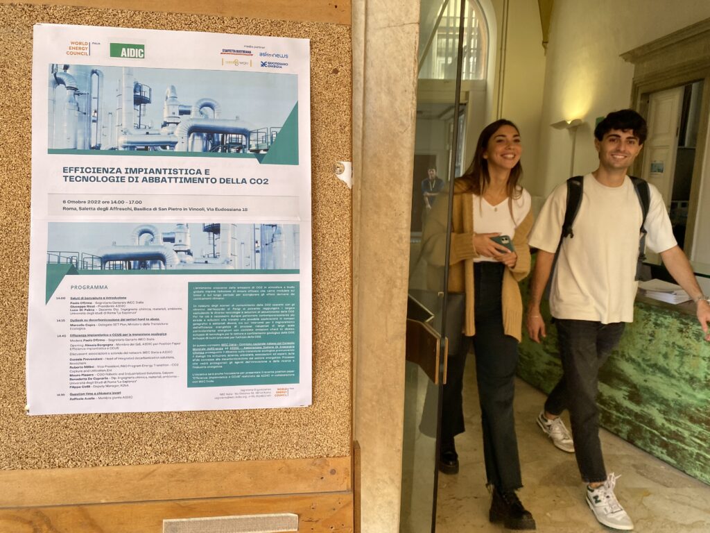 Si è tenuto giovedì 6 ottobre 2022 presso la sede di San Pietro in Vincoli dell’Università La Sapienza di Roma il seminario organizzato da WEC Italia – Comitato Nazionale Italiano del Consiglio Mondiale dell’Energia e AIDIC – Associazione Italiana Di Ingegneria Chimica dal titolo “Efficienza impiantistica e tecnologie di abbattimento della CO2”.