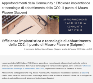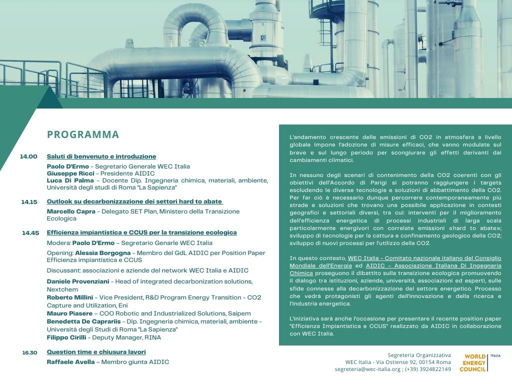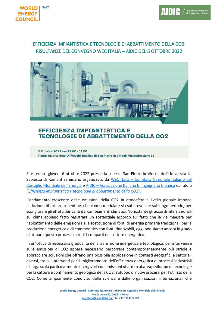 È a partire da queste riflessioni che WEC Italia ed AIDIC, da tempo impegnate in un percorso sinergico di approfondimento sui temi della transizione ecologica, hanno organizzato il seminario “Efficienza impiantistica e tecnologie di abbattimento della CO2”, con l’obiettivo di favorire il confronto tra istituzioni, aziende, università, associazioni ed esperti sulle sfide connesse alla decarbonizzazione del settore energetico. L’iniziativa è stata anche l’occasione per presentare il recente position paper Efficienza Impiantistica e CCUS realizzato da AIDIC in collaborazione con WEC Italia.
