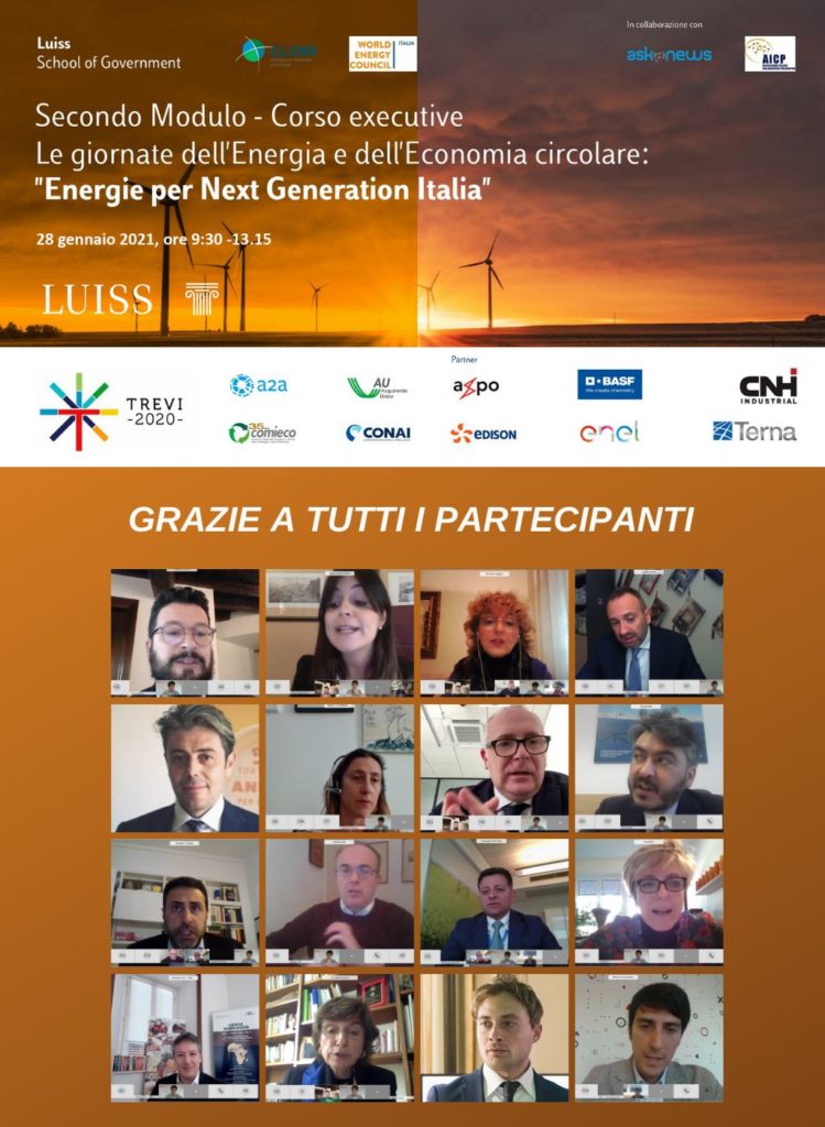 Su questo e altri importanti temi connessi al rilancio sostenibile del Paese abbiamo incentrato il web talk “Energie per Next Generation Italia”, secondo modulo del corso Le Giornate dell’Energia e dell’Economia Circolare organizzato da WEC Italia, Globe Italia-Associazione Nazionale per il Clima e Luiss School of Government lo scorso 28 gennaio. Rappresentanti istituzionali, aziendali e membri dell’Associazione Italiana dei Collaboratori Parlamentari (AICP) si sono confrontati in due talk che hanno offerto numerosi spunti.