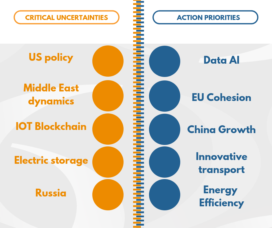 Geopolitical and political issues are both in the Critical Uncertainties (Russia) and in the Action Priorities (EU Cohesion). In fact, Italian energy supplies are characterised by the same European reliance on Russian gas, making EU Cohesion crucial to address diversification and improve resilience. In addition, the historical industrial and commercial relationship between Italy and Russia make geopolitical issues related to Russia critical for the Italian energy sector. At the same time, technology developments bring along the need for a policy and regulatory framework that can enable the development and deployment of new solutions and technologies. This is the case of IoT/Blockchain, as its deployment is still facing consumers’ scepticism and the lack of a clear regulatory framework.